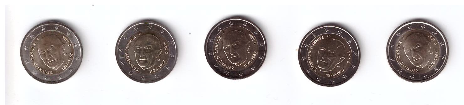2 Euro Deutschland 2026 Adenauer alle 5 Prägestätten