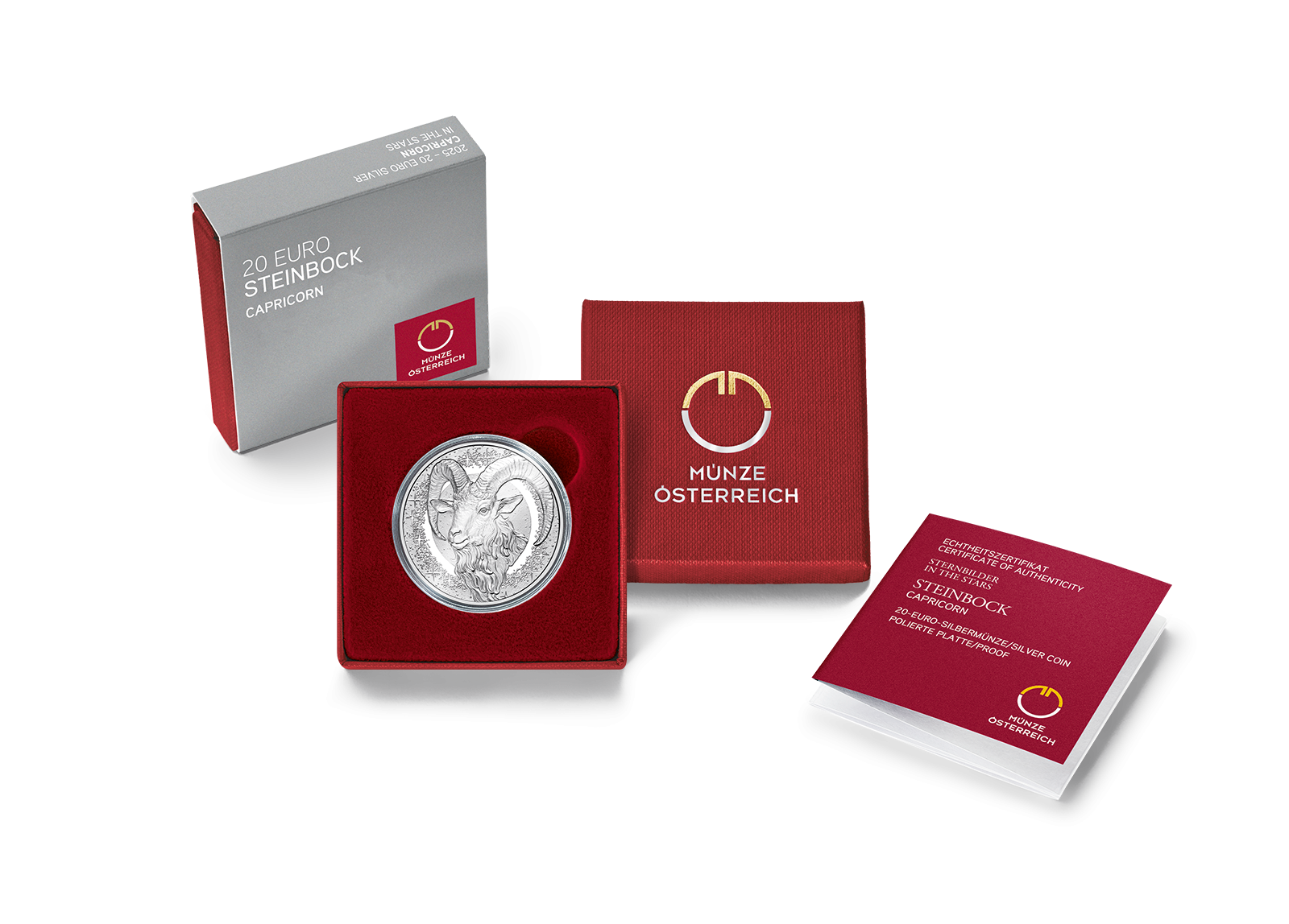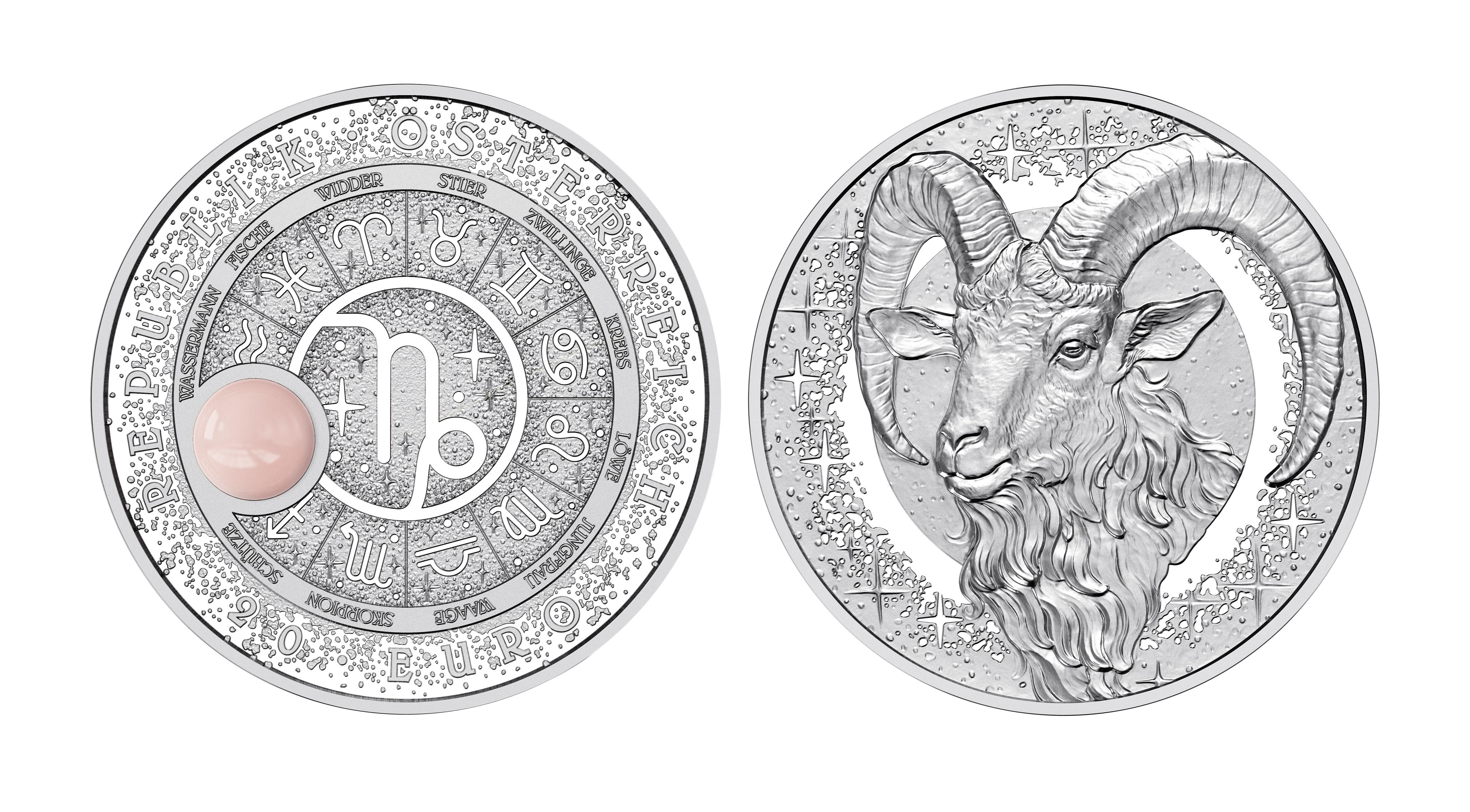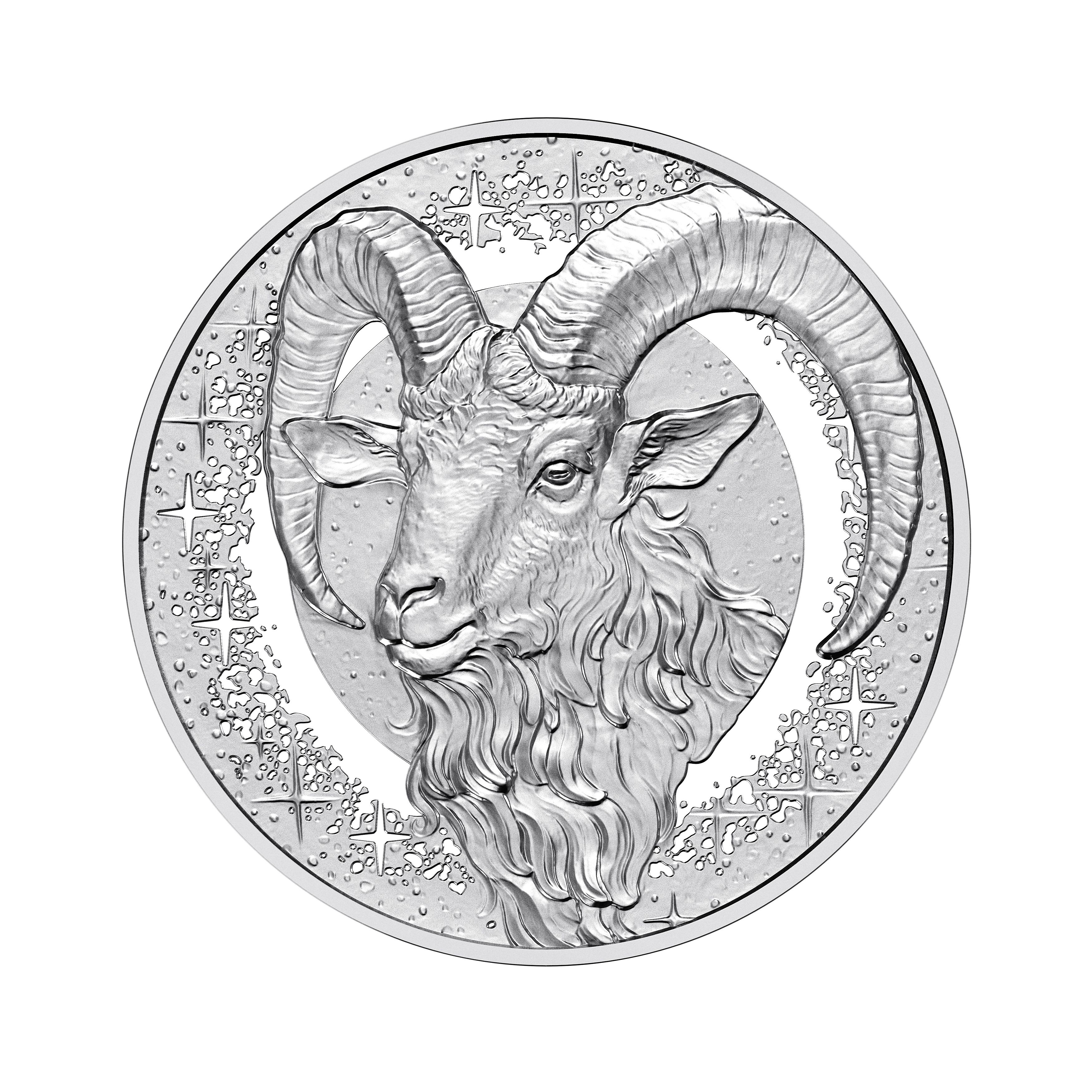 Die andere Seite präsentiert einen Steinbock mit seinen imposanten gebogenen Hörnern. Er ist von einem Kreis eingerahmt, der sich zum Münzrand hin in viele Sterne auflöst.