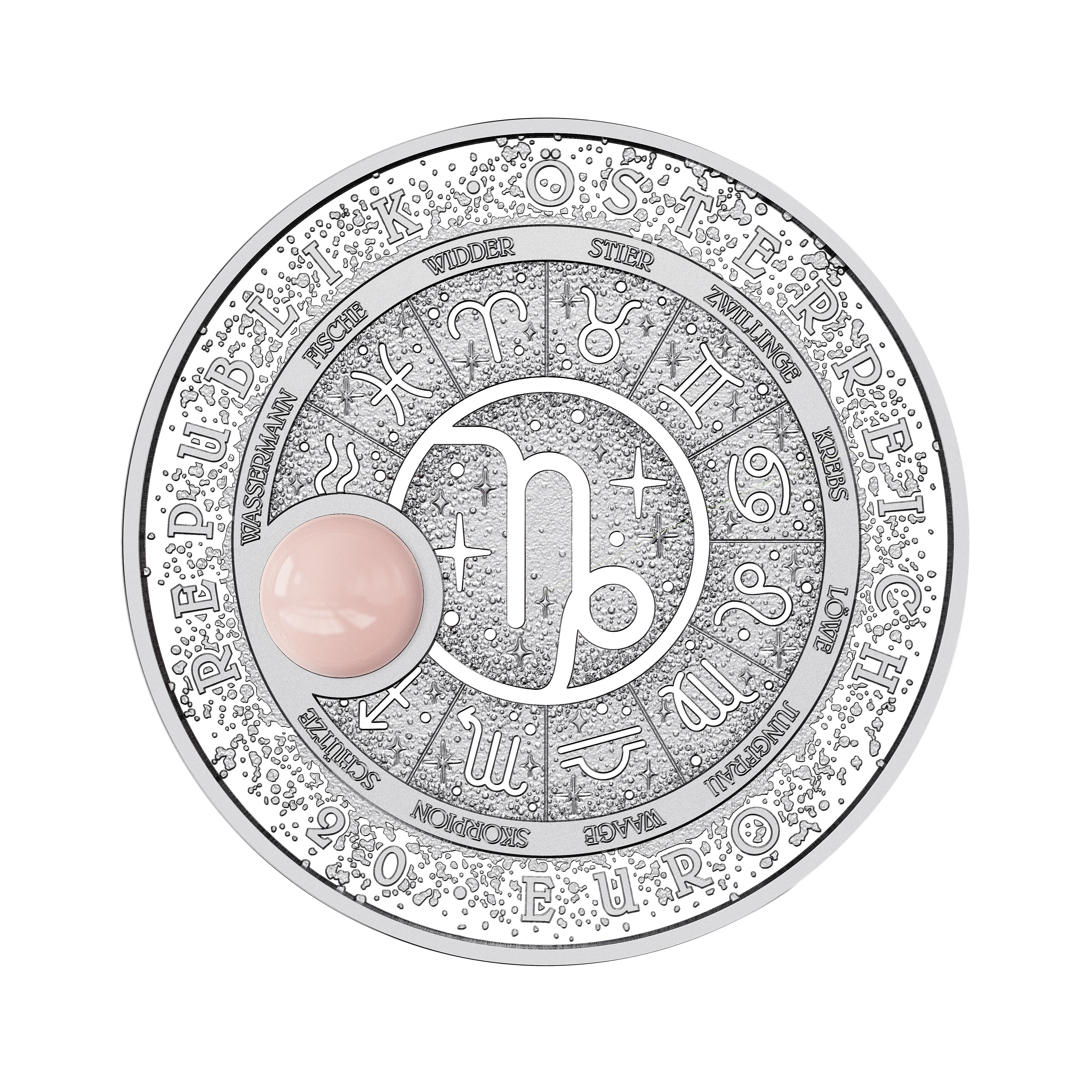 Die Wertseite zeigt den Tierkreis mit den Symbolen aller zwölf Sternbilder. Das Symbol des Steinbocks ist ins Zentrum gerückt; an seiner Stelle am Kreisrand und als sein Begleiter glänzt ein rosaroter Rosenquarz in voller Schönheit. Er ist rund und glatt geschliffen. Seinen Glanz erhält er durch die natürliche Struktur des Steins. Ein Sternenhimmel bildet den Hintergrund.
