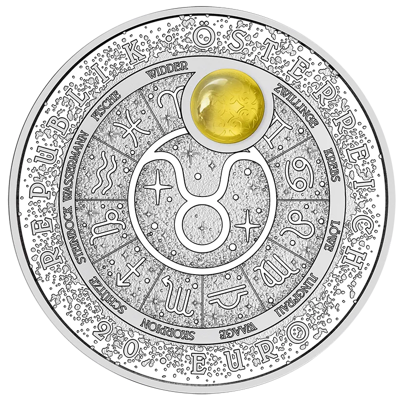 Die Wertseite zeigt den Tierkreis mit den Symbolen aller zwölf Sternbilder. Das Symbol des Stiers ist in den Mittelpunkt gerückt; an seiner Stelle am Kreisrand und gleichsam als sein Unterstützer strahlt ein gelber Bernstein. Seine glatte, runde Form verströmt wohltuende Ruhe. Ein Sternenhimmel bildet den Hintergrund.