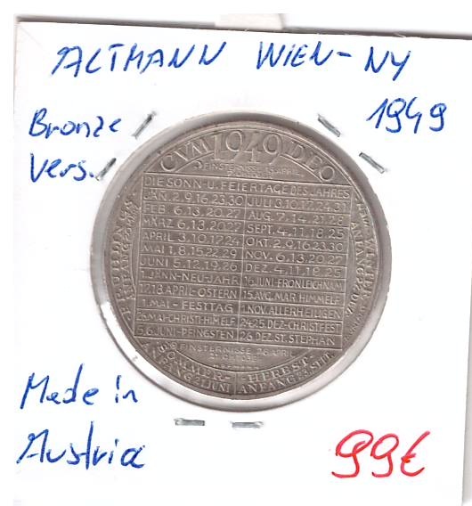 1949 Kalendermedaille Altmann Wien New York Bronze versilbert Made in Austria